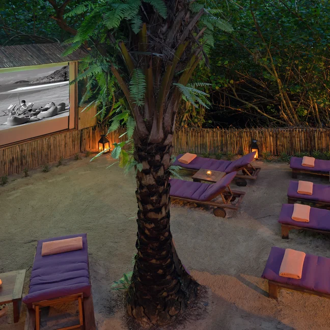 An outdoor path leads to a secret spot with a movie screen nestled among palm fronds. Pick up your popcorn and refreshments, snuggle on your comfy lounger, and enjoy.